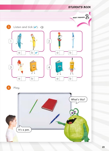 SAMPLE PAGES FROM BFF STUDENT’S BOOK BEST FRIENDS 3 Listen and tick (4). 1 2 a b 4 a b 3 4 a b a b 4 Play. What’s this? It’s a pen. 17 23